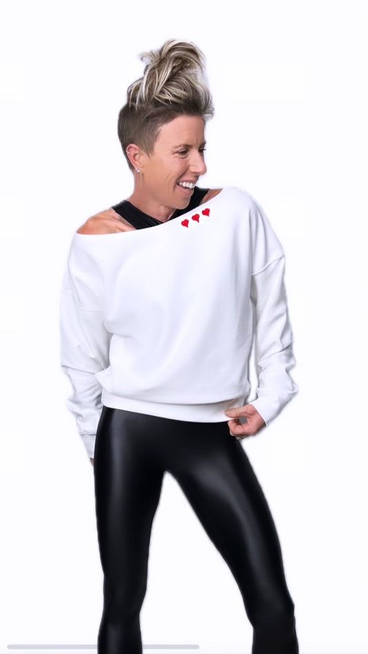 Cold Shoulder Sweatshirt White w/ Red Hearts