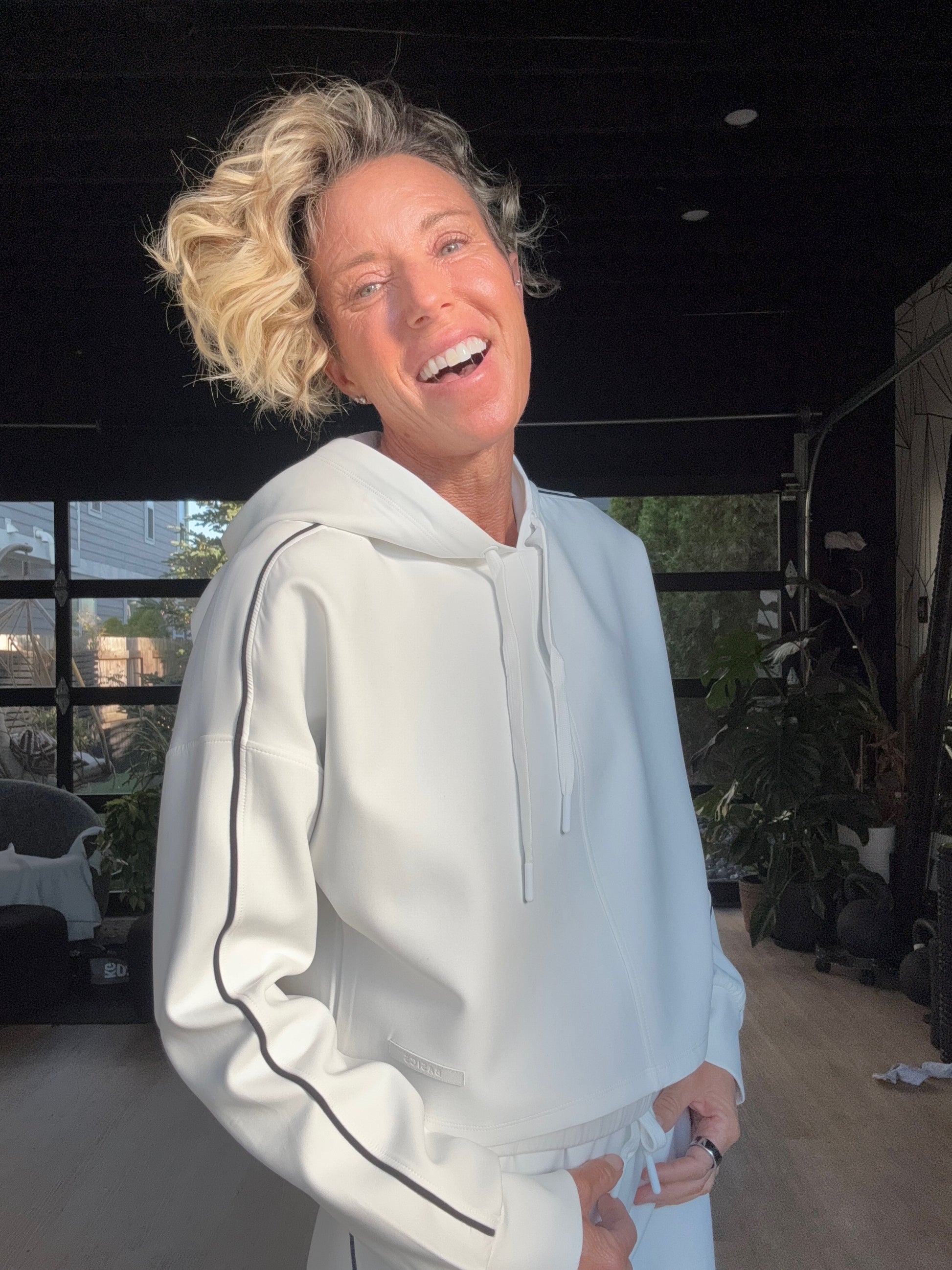This cropped hoodie combines silky-soft spacer fabric with a modern, effortless silhouette. Crisp white piping along the sleeves adds a subtle pop of contrast that keeps the look fresh. Layer it over a tank or wear it solo, either way, it’s a cozy, elevated piece that nails the balance between style and comfort. Perfect for workouts, coffee runs, or any day you want to look put-together without even trying.