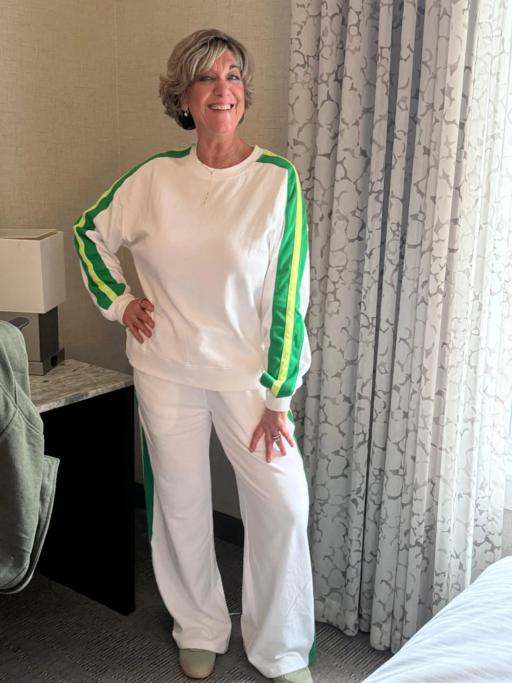 Get ready to celebrate in style with this fan-favorite sweatshirt that's making its grand comeback! Featuring crisp white and green stripes, it's the perfect blend of cozy vibes and a relaxed fit. Pair it with leggings, denim, or our matching Stripe Wide Leg Pants, like Erin, to create an effortlessly cool look that screams festive fun.